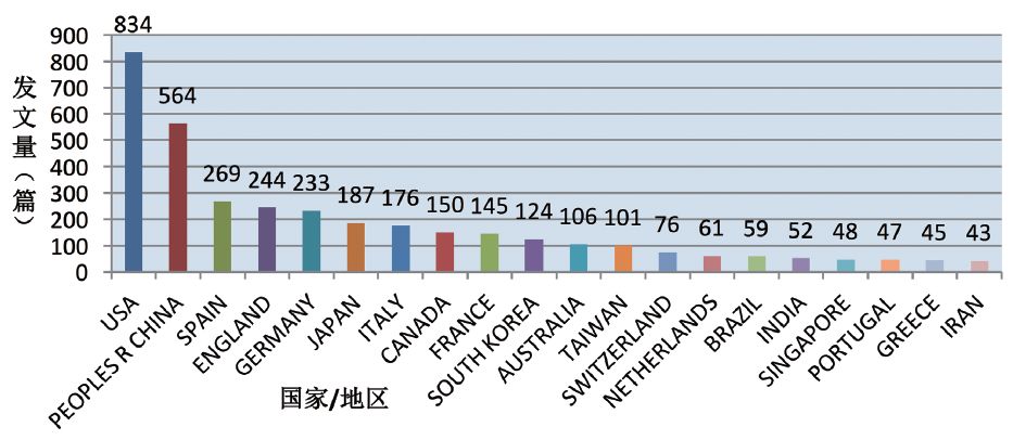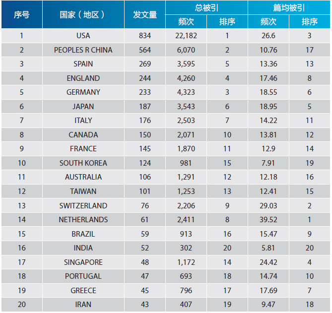 从被引总频次来看,前10位依次是美国、中国、西班牙、英国、德国、日本、意大利、加拿大、法国和韩国。美国总被引频次达22182, 遥遥领先于其它国家;其篇均被引频次为26.6,排在世界第3位。平均被引频次最高的国家是荷兰,达39.52。中国论文总数排第2位,总被引频次排在第2位,篇均被引频次排在第17位。