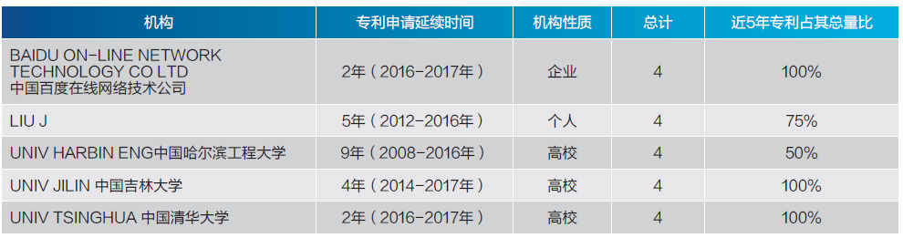 专利申请数量位居前10位的机构有9家为企业,另一家为个人申请。其中美国5家、日本3家、韩国2家。中国在“人工智能在智能驾驶工程技术开发中的应用”领域申请专利排名前五位的研发机构/个人分别是百度在线网络技术公司、LIU J、哈尔滨工程大学、吉林大学、清华大学。