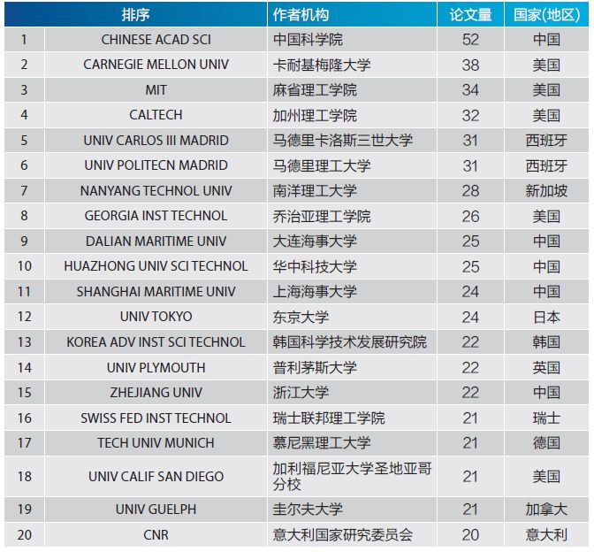 2 c7 s* c* R8 X/ Q+ k' X表1列出了全球发表的关于“人工智能在智能驾驶工程技术开发中的应用”的前二十位发文机构。其中,中国、美国各5家,西班牙2家, 新加坡、日本、韩国、英国、瑞士、德国、加拿大和意大利各1家。发文量排名前5位的机构依次是中国科学院、美国卡耐基梅隆大学、美国麻省理工学院、美国加州理工学院和西班牙马德里卡洛斯三世大学。前二十位发文机构以高校和科研院所为主。
