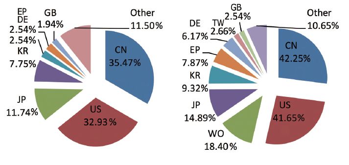 $ O0 Q8 X$ V8 g从专利技术的国家(地区)来源来看,中国的专利技术最多,占总数的35.47%;其次是美国, 占总数的32.93%。从专利技术的市场分布来看,专利主要分布于中国、美国、WO、日本和韩国。中国、美国及日本等国是基本的技术输出国。' n& y4 \0 [' j9 l5 B, c( _: O$ h