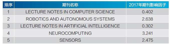 / ]9 ^! W: g9 f6 u该主题发表论文涉及期刊1000多种,发文量最多的前五种期刊分别是:LECTURE NOTES IN COMPUTER SCIENCE (108 篇)、ROBOTICS AND AUTONOMOUS SYSTEMS (96篇)、LECTURE NOTES IN ARTIFICIAL INTELLIGENCE (86篇)、NEUROCOMPUTING (80篇) 和SENSORS (64篇)。