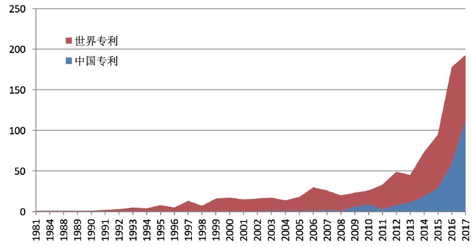2 K9 a' a1 C& h n a中国自2003年就有相关专利申请,前期发展缓慢,近十年来中国发展迅速,2017年中国的专利年申请量超过美国,跃居世界第一。中国的专利申请变化趋势与国际专利申请趋势大致相同,但是时间跨度上滞后于国际申请17年。