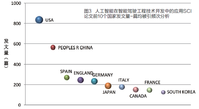 1 T; J) ~/ E+ I' z! Y图3 人工智能在智能驾驶工程技术开发中的应用SCI论文前10个国家发文量-篇均被引频次分析