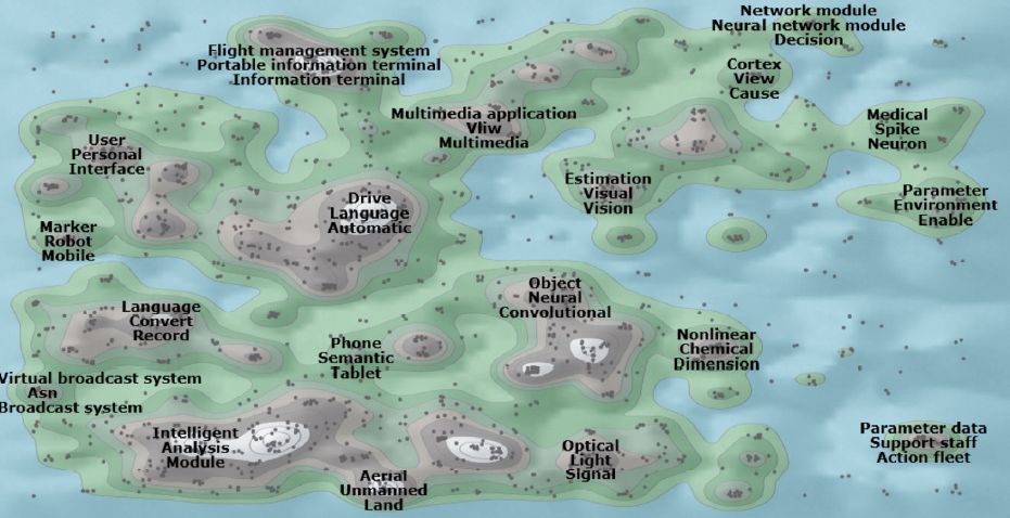 基于专利题名和摘要关键词绘制“人工智能在智能驾驶工程技术开发中的应用”研发主题布局专利地图,由图7可以看出,“人工智能在智能驾驶工程技术开发中的应用”领域关注主题明显集中于自动化驾驶语言(drive language automatic)、对象神经卷积(object neural convolutional)、智能分析模块(intelligent analysis module)、飞行管理系统便携式信息终端信息终端(flight management system portable information terminal information terminal)、语言转化记录(language convert record)等方向。