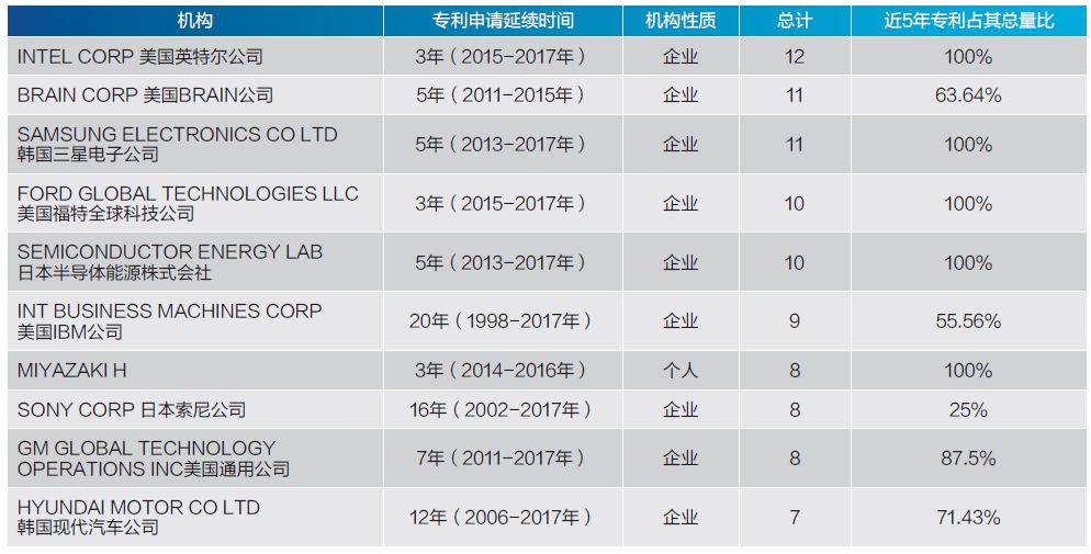 / {! ~9 U2 X/ V. h- \从检索结果看,约有800多家机构/个人活跃在“人工智能在智能驾驶工程技术开发中的应用”研发领域。专利申请数量位居前10位的机构有9家为企业(表4),另一家为个人申请。其中美国5家、日本3家,韩国2家。