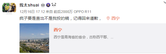 这个疑似的小号里,说自己暂时离开微博几天,定位是西宁,巧的是金瀚就是西宁人。