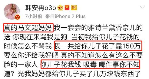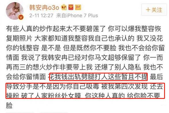 " w# S7 g4 @' ]; o8 k' R6 E这一下惹怒了韩安冉,把马文超出轨 劈腿 吸du 睡粉,恶心事一大堆通通抖了出来。 1 j* z6 S8 s* {/ q8 z