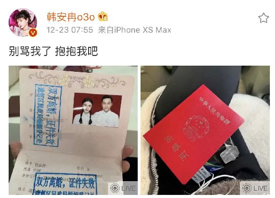 9 o7 Z B) U9 e; r8 n/ _8 s0 W网上有人爆料,韩安冉可能是12月19号那天,和老公小猪领的离婚证。 5 L+ U+ B5 O4 j& X8 m' m6 ~8 t