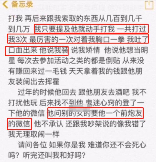 韩安冉还说马文超家暴,只要她一提分手,马文超就动手打人。 * J3 R* I$ I* O# l