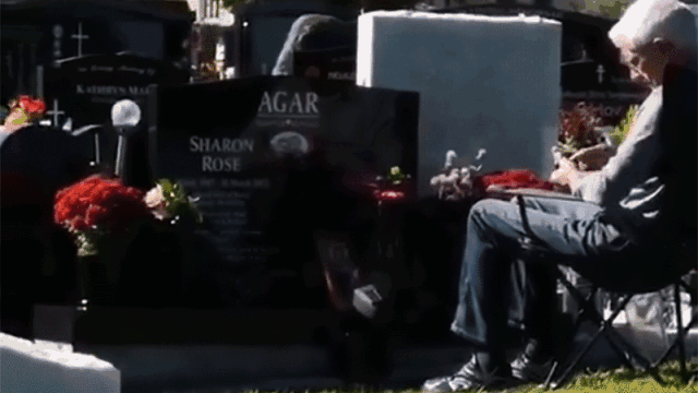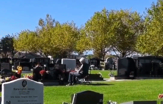 1 u' k* D6 {. b C0 Z一位老先生,坐在墓碑旁边,安静看着书。: { u+ x' X/ x0 L9 R2 Z9 x