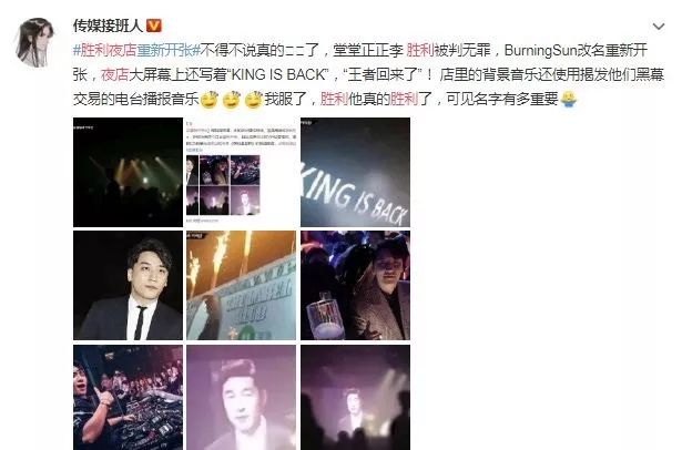 胜利夜店重新开张,堂堂正正李胜利被判无罪,BurningSun改名重新开张,夜店大屏幕上还写着“KING IS BACK”,“王者回来了”! 店里的背景音乐还使用揭发他们黑幕交易的电台播报音乐,我服了,胜利他真的胜利了,可见名字有多重要。/ |' S7 b$ R) A! J, z0 h