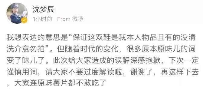 但这次显然没那么容易了,她微博道歉说“原味”是为了表达物品都是本人的并且都清洗干净了,是用词造成的误解请大家不要过度解读,可随着舆论的不断发酵,最终只能选择停掉自己的账号。