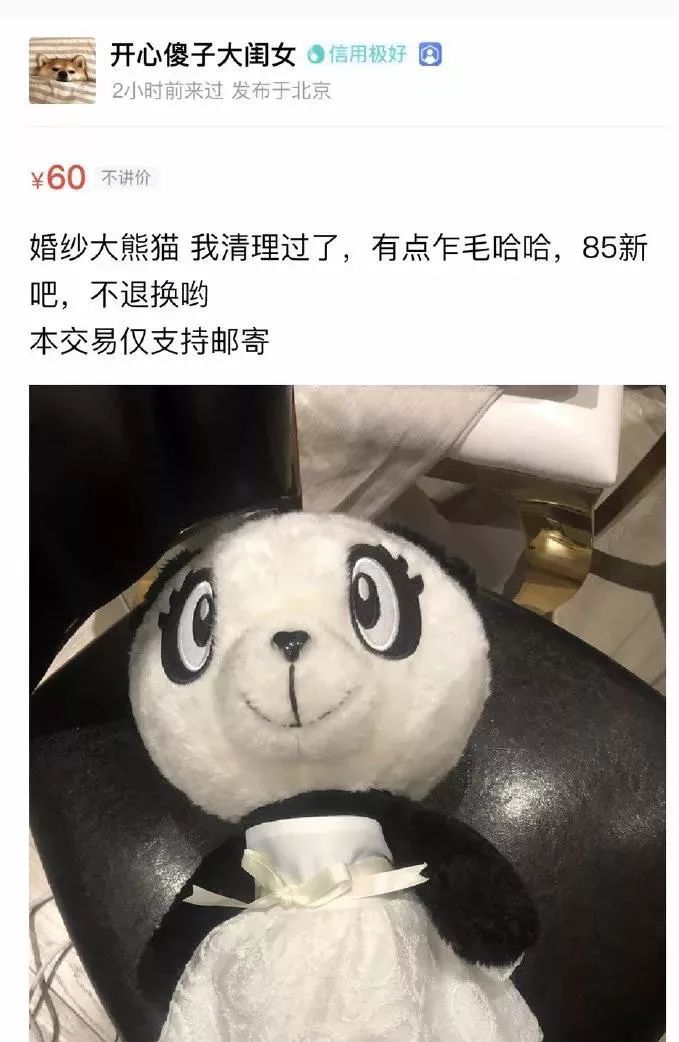 ; j$ F9 n2 v) o2 R# _. d首先是吴昕,被网友发现她将六年前钟汉良送的一只穿婚纱的大熊猫玩偶在寄售平台上六十块钱卖出了。