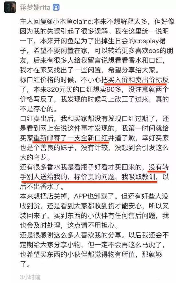 去年被媒体曝光卖二手口红的蒋梦婕就是其中之一。买家查了产品批号发现是过期的,最尴尬的是,卖的二手香水对比的价格都是国内专柜价,一点也不比很多渠道新品的价格低,而其中一件原价标注一千多的衬衫更是被评论扒出其实找代购新品只需要两百多,后来她以不再卖货收场。- J& a& O: g& ]7 a; ?