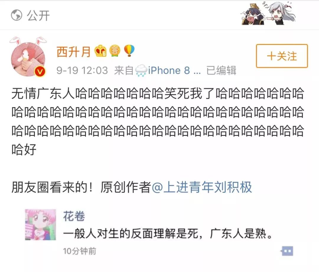 5 H, f, s& y1 ]2 J' Q* j@学历史的可怜虫:突然觉得和广东人谈恋爱真的太有趣了,特别是每次我说“卧槽”而他说“我丢”的时候。