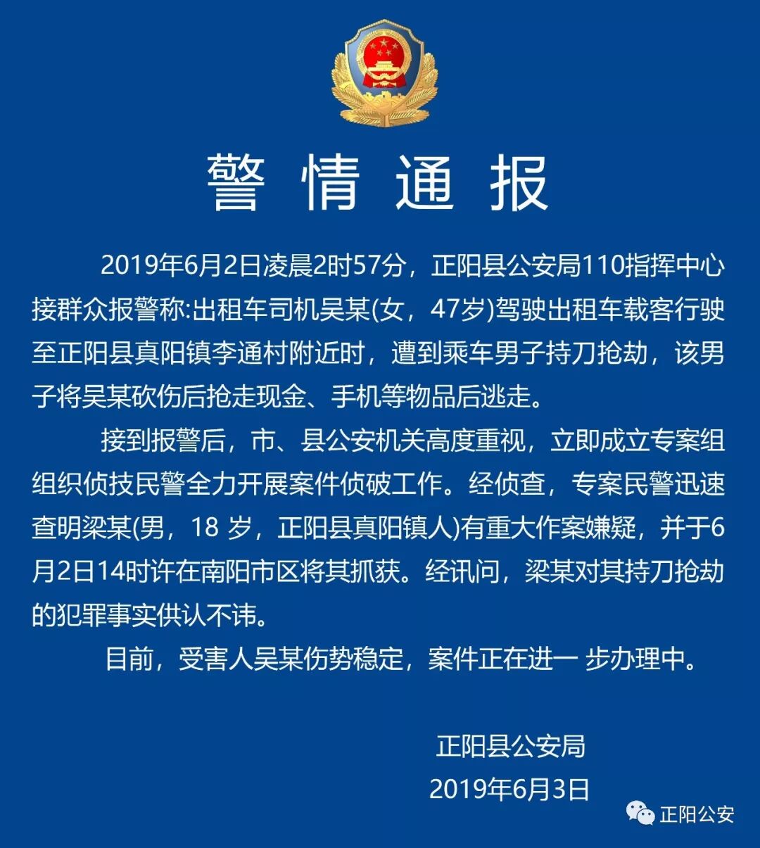 9 m' d8 j: Y, N* _; L3 f8 u2019年6月2日凌晨2时57分,正阳县公安局110指挥中心接群众报警称:出租车司机吴某(女,47岁)驾驶出租车载客行驶至正阳县真阳镇李通村附近时,遭到乘车男子持刀抢劫,该男子将吴某砍伤后抢走现金、手机等物品后逃走。7 J4 [! M6 {- }, O0 ]( f