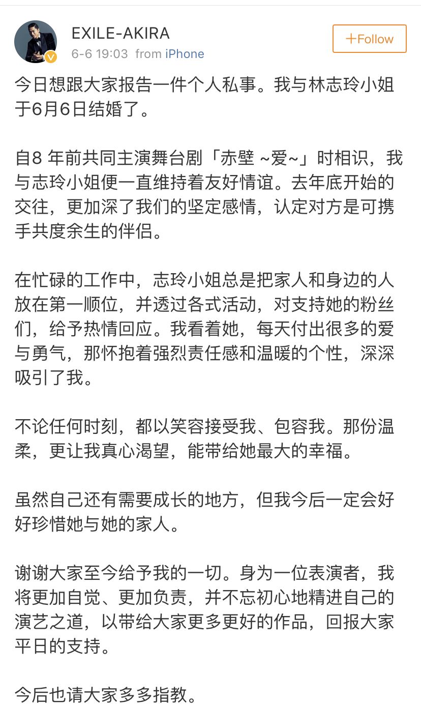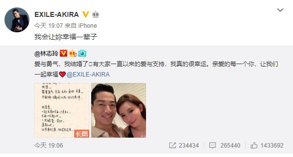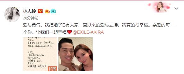 ▲六月份的甜蜜炸弹由林志玲送出,志玲姐姐直接在微博上公布了自己的婚讯,差点以为又是哪个营销号爆的料,定神一看才发现,确实是本人无误。