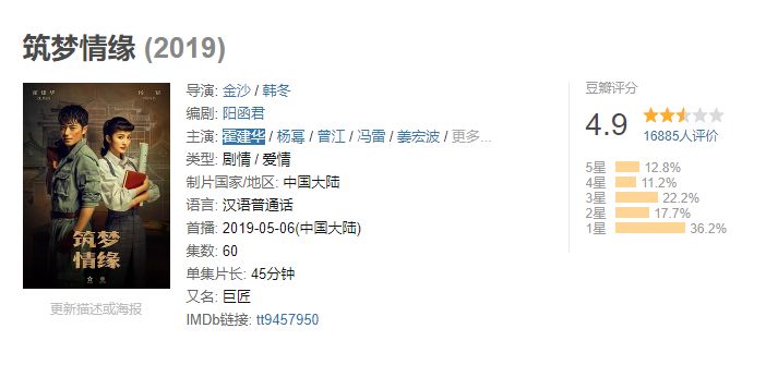; F2 z6 ^0 Q% Y& i3 c不过回过头来看,《筑梦情缘》的平均收视率竟然没有破1,该剧也成了今年芒果台播出的剧集中,收视率唯一没有破1的作品,连大结局都只有0.64。