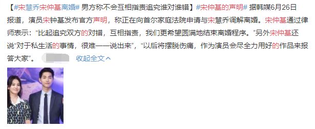 * l, }# J; Y) U1 j" R- q/ P) ?- |据韩国媒体报道, “双宋”之前就多次爆出离婚,后又出来辟谣,这次是真的离了。