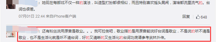 3 ^" c' ]9 d8 k$ e而粉丝则表示用自己的原音是敬业,但是如网友所说:敬业指的是用原音能说好台词是敬业,不是说的听不清是敬业,也不是生活化就是听不清台词,好的又清晰的又生活化的台词功底请参考武林外传。