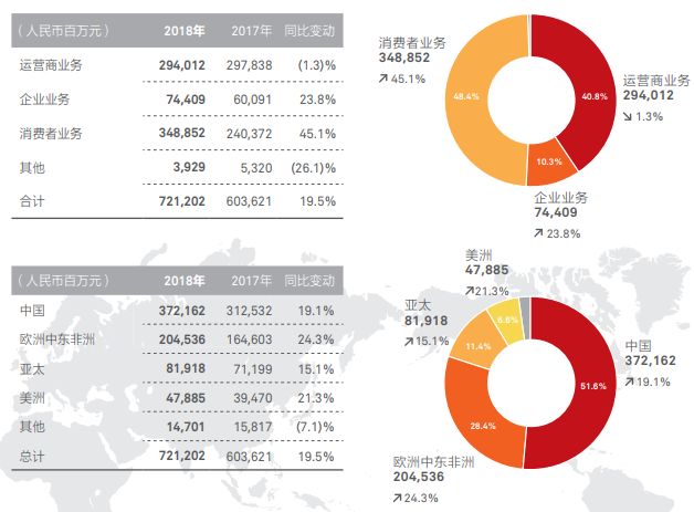 6 x) s! u% a0 |; X, U由下图可知,华为去年的消费者业务增幅最大。
