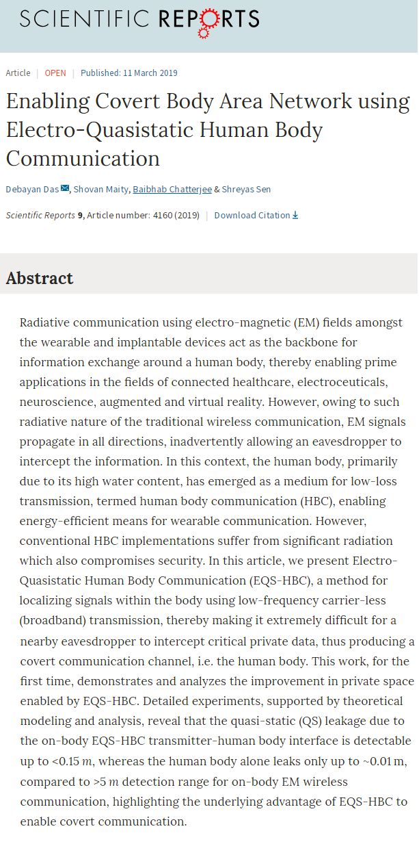 ' p `5 B6 b8 nSen和他的同事们称之为“电准静态场人体通信”(EQS-HB),并在本月早些时候的 Scientific Reports期刊上对此进行了介绍(论文标题为“Enabling Covert Body Area Network using Electro-Quasistatic Human Body Communication”)。在这项研究中,Sen的原型成功地将来自可穿戴设备的信号限制在了人体内。研究人员还没有在佩戴着植入式医疗设备的人身上测试他们的原型。( X' `! P6 R2 ~2 e0 J+ G- i+ R