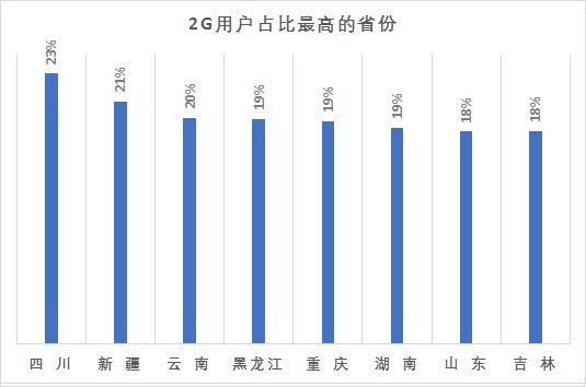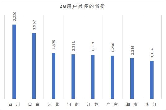U- t- @: b* G. p6 Y按照分省情况来看,有8个省份的2G用户数超过1千万,其中四川的2G用户最多,高达2220万;2G用户占比最高的8个省份中,同样是四川的2G用户占比超过23%。$ e, w2 B, ?2 L0 \0 Z