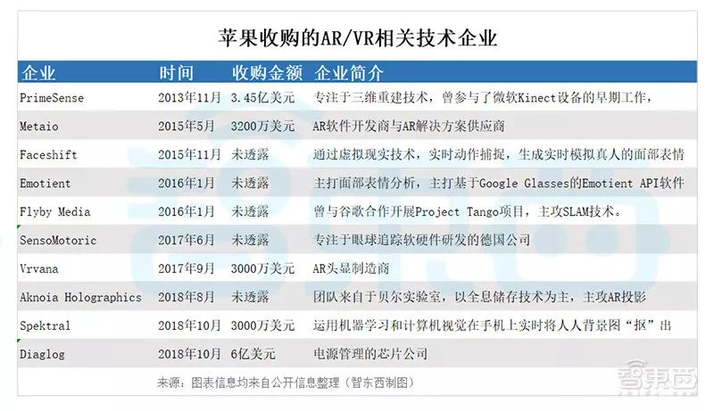 除了以上两家AR企业之外,苹果这些年还收购了多家AR/VR企业,其中不乏在业界非常知名的企业,包括苹果于2013年以3.45亿美元收购的PrimeSense,这家公司是一家利用结构光做三位扫描的以色列公司,2015年收购了做实时动作捕捉的瑞士Faceshift公司,2016年苹果收购了两家公司,面部表情识别公司Emotient和通过摄像头的图像与传感器确定自身方位的创业公司Flyby Media。2017年苹果收购了专注于眼球追踪软硬件研发的德国公司SensoMotoric Instruments和加拿大蒙特利尔的AR头显制造商Vrvana,2018年苹果还收购了专注于实现手机端实时视频人物背景分离(抠图)的Spektral公司。