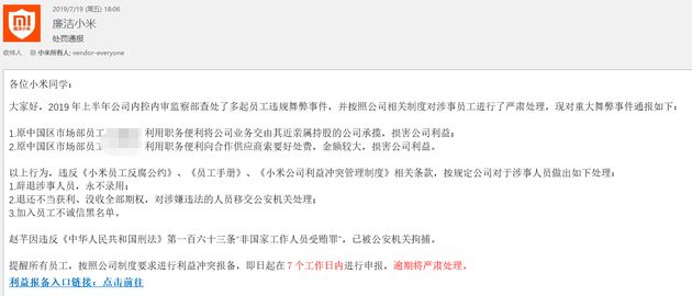 小米通报内部贪腐:没收期权 永不录用' U% `, ]3 [# M5 w* A