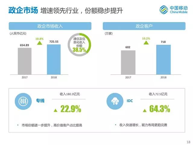 ! x% `& J; N' I g; s1 R中国移动2018年全年收入超过8400亿元人民币,其中政企客户总数达到718万家,客户数同比增长19.2%,该业务全年业务收入725.55亿元,同比增长10.8%。具体业务方面,集团语音、短彩信全年收入260.30亿元,专线、IDC去年全年收入252.86亿元。9 s4 g9 x: |2 P' \+ a* M+ l/ B