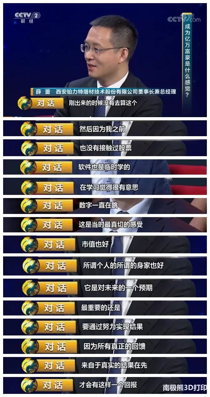 2019年07月29日,南极熊3D打印网注意到,央视经济频道CCTV2播出了《对话》 20190728 科创板来了,主持人陈伟鸿,与苏州华兴源创董事长兼总经理陈文源、西安铂力特增材技术公司董事长兼总经理薛蕾、中国铁路通信信号集团董事长周志亮,一起探讨科创板对中国科技型企业的意义和作用。