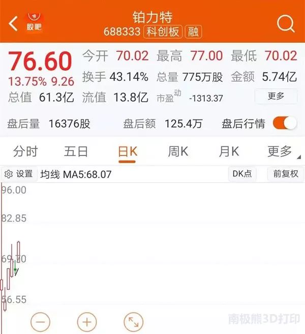 8 H7 x. @6 R) J, L7 n% e) ?. h△截止2019年7月29日下午收盘,铂力特股价76.6元,市值61.3亿元。南极熊看到,纯正的3D打印科创板第一股,金属3D打印专家铂力特自7月22日上市以来,股价总体上连续大涨,受到投资者的追捧。* |; \6 l2 E: ^% W. E6 x; Z