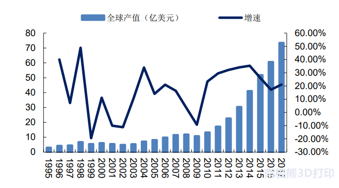 9 ?* |) q9 H" ?9 g) l M3D 打印在小批量、定制化、复杂结构成形等领域的突出优势,使其在高端制造领域获得广泛应用,工业机械、航空航天、汽车、消费电子、医疗是目前主要的应用领域,合计占比达到 78%。随着 3D 打印应用的增长,3D 打印的市场规模也快速扩大,全球 3D 打印产值(包括产品和服务)从 2012 年的 22.8 亿美元增长到 2017 年的 73.36 亿美元,五年来增长超过 300%,年复合增长率高达 26.20%。