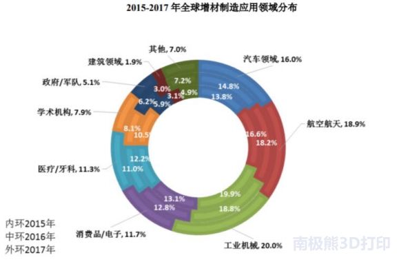 @. u" B) q( ` n3 t所见即所得,3D 打印特色明显前景广阔。3D 打印独特的逐层叠加材料的制造方式使其具有简化制造程序,缩短新品研制周期,高效成形复杂结构的特点,在小批量、定制化和复杂结构制造方面应用优势明显。3D打印当前处于推广渗透的高速成长阶段,2017 年全球市场规模达到73.36 亿美元,五年复合增速达到 26.20%,航空航天、工业机械、医疗是 3D 打印的主要应用领域。