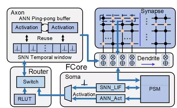 % {2 {) n1 t' H 图4d是一个完整的单功能核(FCore)示意图,包括轴突、突触、树突、胞体和路由部分。为了实现深度融合,几乎整个FCore都可以重新配置,以便在不同模式下实现高利用率。FCore能够涵盖大多数ANN和SNN使用的线性积分和非线性变换操作。该芯片上的FCores以二维2D网格方式排列,如图2e和2f所示。
