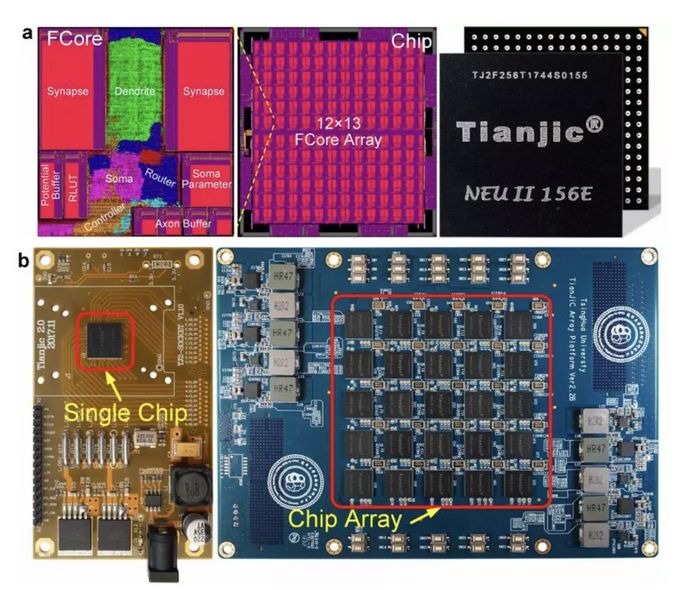 & Q; D% X) x8 c' V& ^0 i图1 Tianjic芯片和测试板 F4 j, b7 k3 @) l