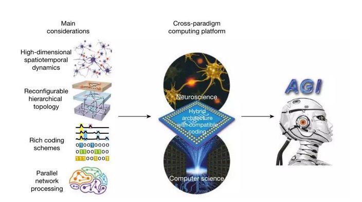 一般认为,实现通用人工智能(AGI)有两条路:分别为计算机科学导向和神经科学导向。由于这两条路的思路、理念和实现方案存在根本差异,分别依赖于不同开发平台,彼此互不兼容,这给AGI技术的开发造成很大阻碍。目前迫切需要一个同时支持两种方法的通用平台。施路平团队开发的“天机芯”(Tianjic芯片)就做到了这一点,可以为AGI技术提供一个混合协同的开发平台。