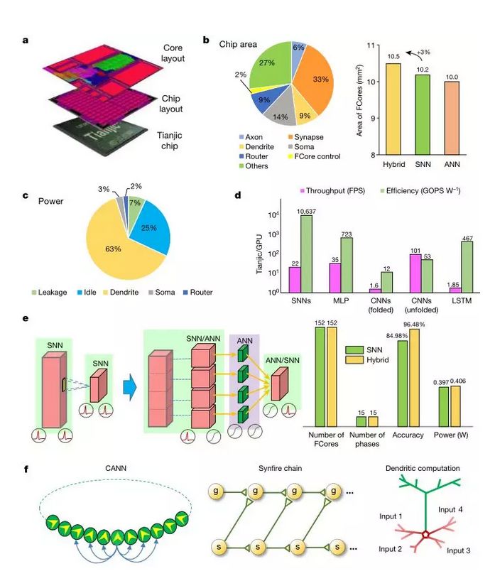 ( ~1 X) B; i# y0 c: z4 m3 t Tianjic芯片和其后端布局图如图5a所示。芯片由156个FCore组成,包含大约40000个神经元和1000万个突触。Tianjic芯片采用28纳米半导体工艺制造,面积为3.8×3.8平方毫米。每个独立模块占用的芯片面积,包括轴突,电流,信号,路由器,控制器和其他芯片开销,如图5b所示。由于资源可以重复使用,用以兼容SNN和ANN模式的区域仅占总面积的3%左右。FCore的功耗分解如图3c所示。" V9 T; ^3 K, G* ^