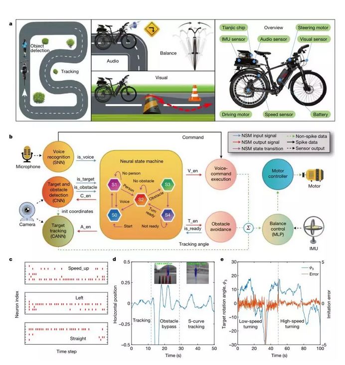 为了证明构建类脑跨范式智能系统的可行性,团队利用无人驾驶自行车发展了一个异构可扩展人工通用智能开发展示平台,在一块Tianjic芯片内并行部署并同时运行多个专用网络。实验中的自行车配备了多种算法和模型,能够执行实时物体检测、跟踪,语音命令识别、加速、减速、躲避障碍、控制平衡和决策等任务。