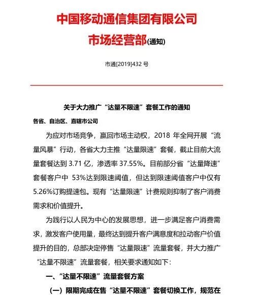 . B* k/ C, {# Z9 m4 J0 o/ x据内部人士爆料:近日,中国移动内部已发文《关于大力推广"达量不限速’套餐工作的通知 》:7 k8 c$ t$ u! o