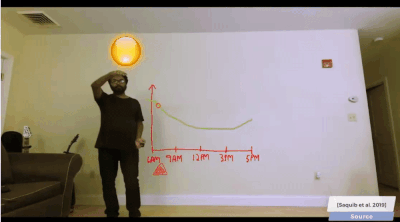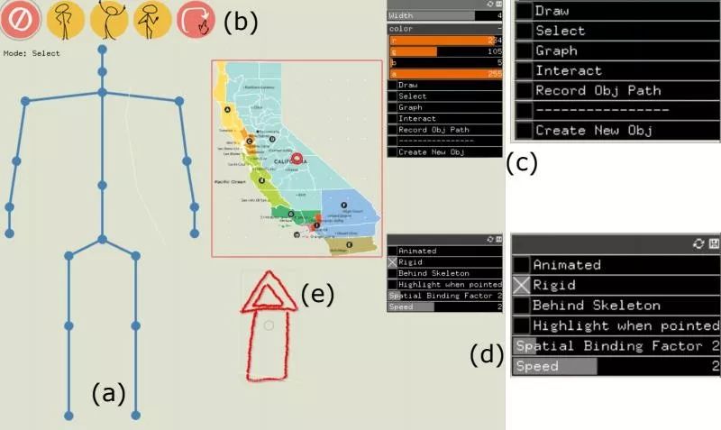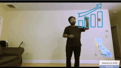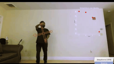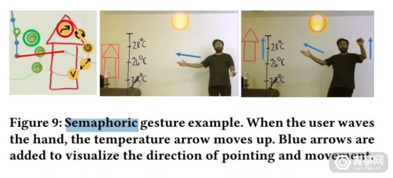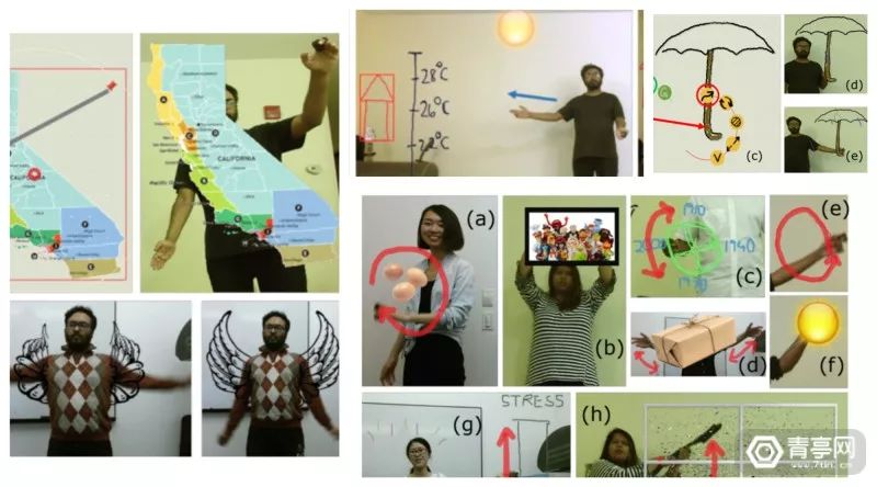 * G: y9 d' m' H' R: [此外,类AR也可以作为一款足够有趣的叙事工具。比如MIT媒体实验室与Adobe研究所近期开发了一款支持实时交互的AR视频系统,它可以让用户用肢体语言来指挥虚拟的视觉元素,并通过这种方法来叙事。+ v0 z9 @# n1 b; E6 v" a/ H8 ?' Z* i