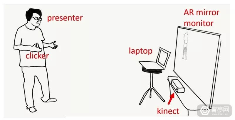 据了解,该AR视频系统的硬件配置足够简单,只需要一台电脑/笔记本、一个Kinect体感传感器和一个穿戴式遥控器,也可以再加上一个用来预览AR效果的额外显示屏。有了这些装备,用户可以在拍摄视频的同时,用各种肢体语言来“画图”,或者触发雷雨AR特效。