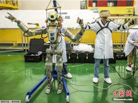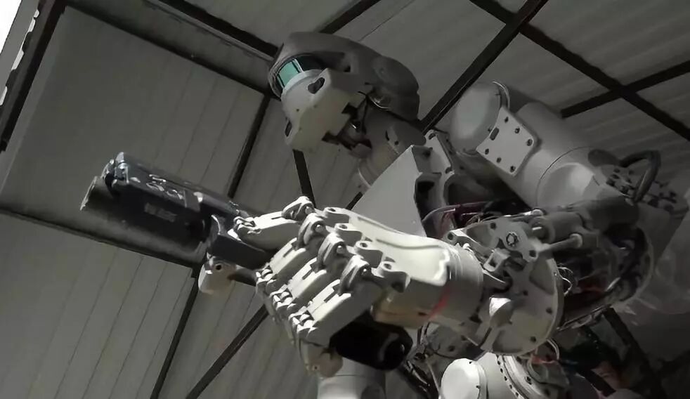 图为俄罗斯首个宇航用途的人形机器人Skybot F-850,该机器人身高超1.8米,重163公斤,不仅能开车、做俯卧撑和双枪快速射击等。+ Z2 L3 S: f+ e9 y- }2 c