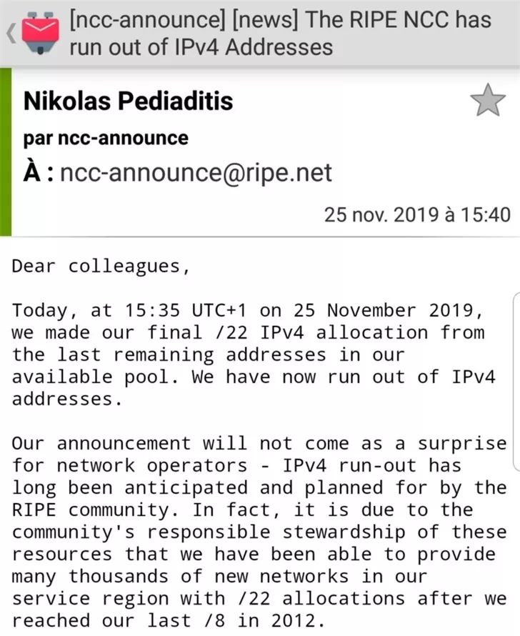 随着 2019 年 11 月 25 日 UTC + 1 15:35 欧洲网络信息中心(RIPE NCC)从可用池中进行最后的 /22 IPv4分配,全球所有 43 亿个 IPv4 地址都已分配完毕,意味着没有更多的 IPv4 地址可以分配给互联网服务提供商(ISP)和其它大型网络基础设施提供商。1 ?$ F; d- b0 b( i: f9 ^0 {