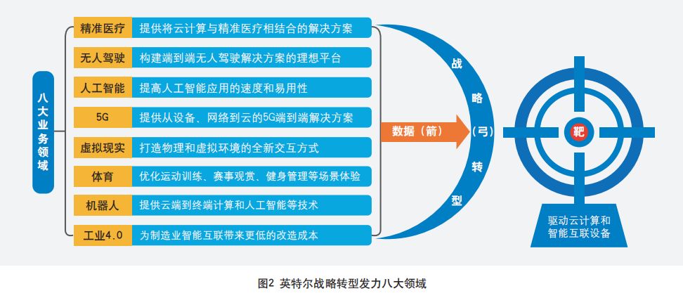 为应对市场环境的变化,英特尔正在重新定义和拓展自己的市场版图。2016年,英特尔正式对外宣布实施战略调整,将从一家单纯提供芯片的公司转变为提供包括芯片、IP、算法等在内的综合解决方案的公司。面向万物智联转型的英特尔,触角已从PC行业、IT行业延伸到实体经济的各行各业。