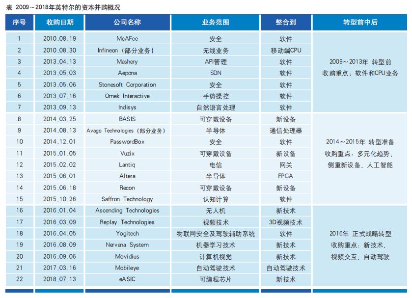 经过两年的准备期,2016年,英特尔正式对外宣布要转型为驱动云计算和智能互联设备的公司,其资本并购重点也相应地投向了以数据为中心的技术上:收购Yogitech专注于物联网安全,收购Nervana用于提供高度优化的人工智能解决方案,收购Movidius旨在赋予机器视觉能力;2017年,英特尔收购智能汽车芯片公司Mobileye,用于增强其在无人驾驶技术方面的实力。