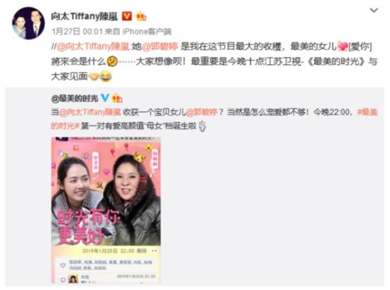 还借节目的父母互换环节,提前过了一把当郭碧婷母亲的瘾,节目后还发微博感叹“节目里最大的收获是最美的女儿”。