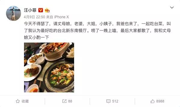 4月9日晚,汪小菲在微博晒出一张美食的照片,庆祝老婆大S回家,他在配文写道:“今天不得瑟了,请丈母娘,老婆,大姐,小姨子,我爸也来了,一起吃台菜,叫了我认为最好吃的餐厅。唠了一晚上嗑,最后大家都散了,我和丈母娘又小酌一下 !”照片里的餐桌上满桌的美食,看起来十分美味。
