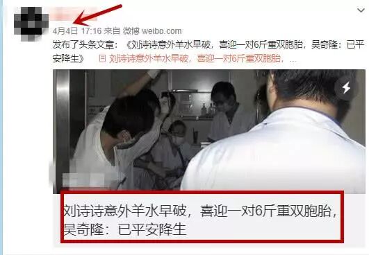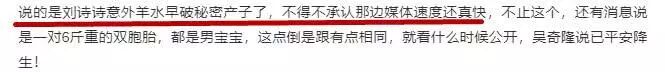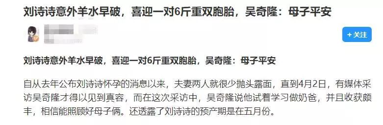 刘诗诗喜迎双胞胎男宝,吴奇隆回应平安降生?工作室目前没辟谣! |
