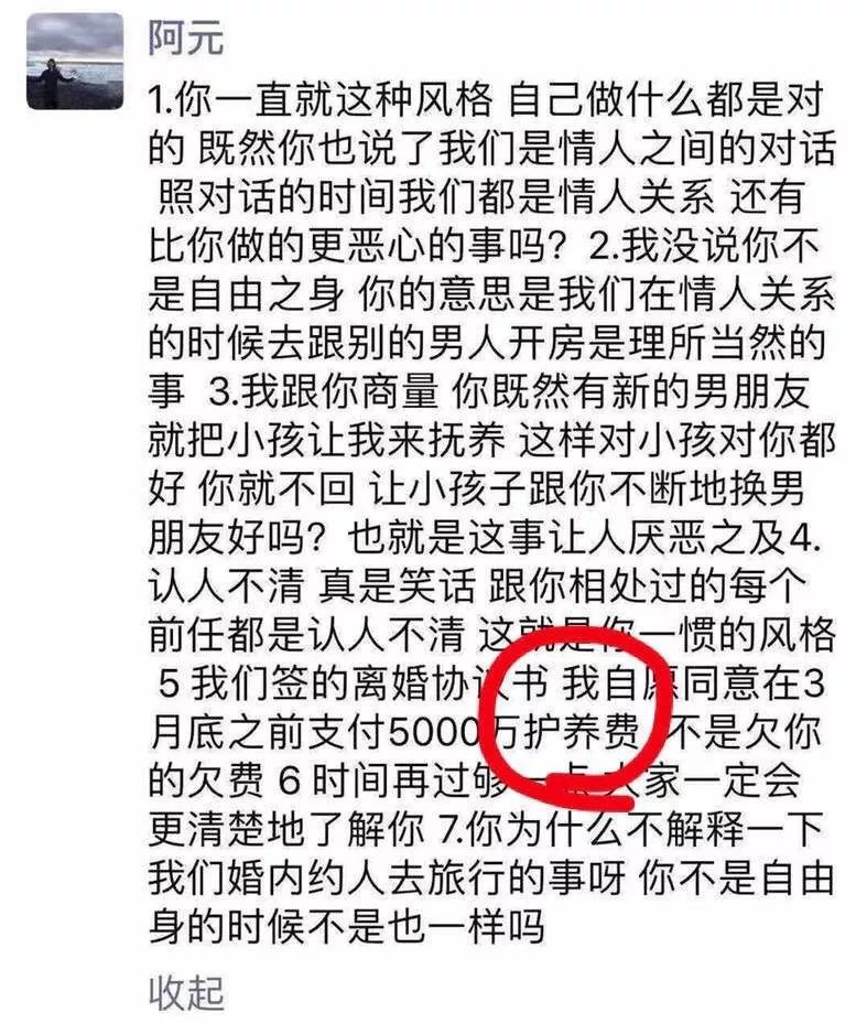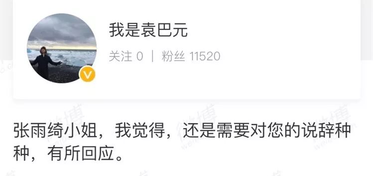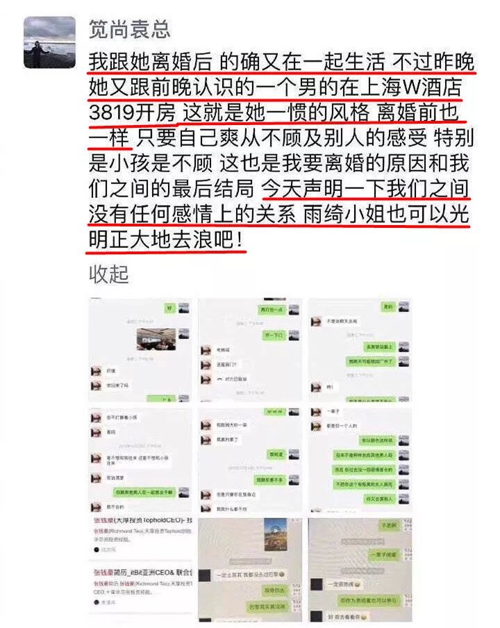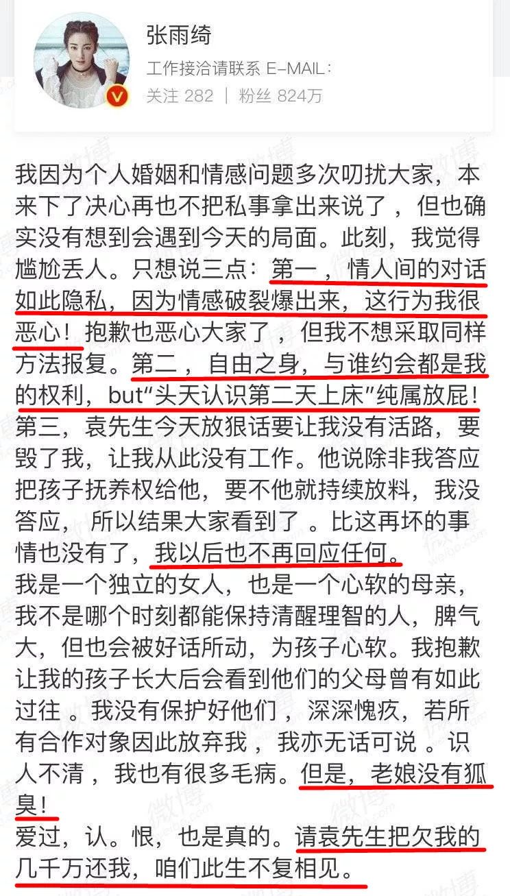 - y6 q4 s" S L7 Z今年一月,袁巴元发朋友圈先承认俩人离婚又复合了,紧接着又爆料张雨绮跟刚认识一天的男生去开房,并称这是她一贯的风格,离婚前也一样。